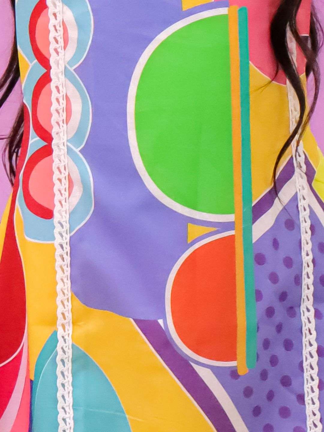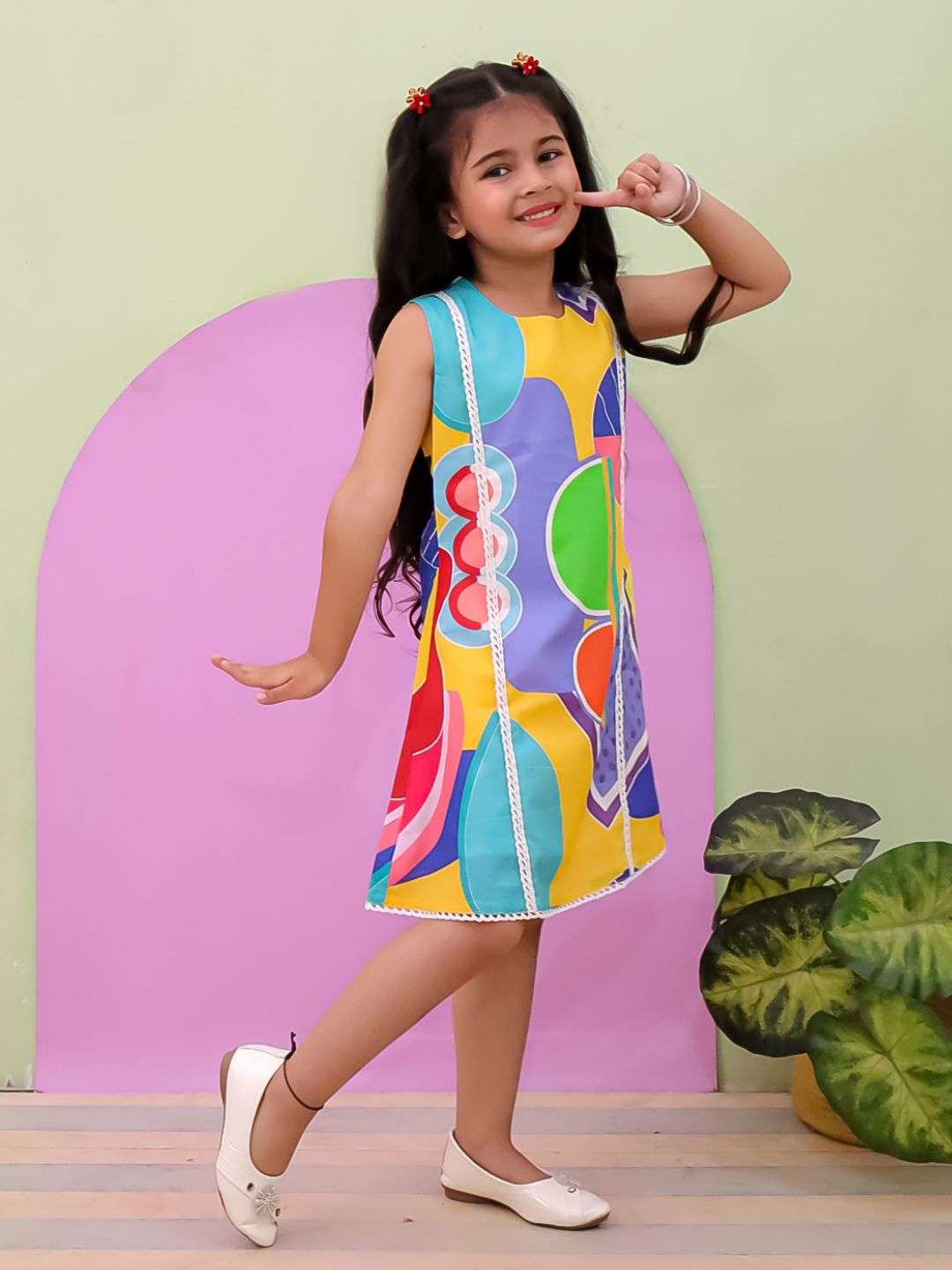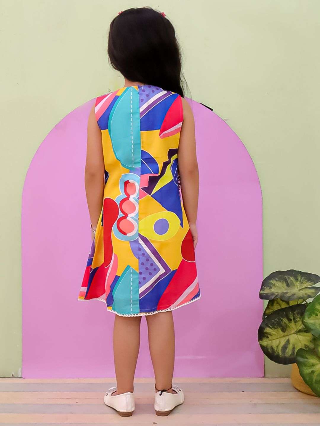 This Abstract geometric print Pure Cotton A-Line Frock is a burst of joy for your little one’s wardrobe. Made from breathable 100% cotton, it ensures all-day comfort while keeping the skin safe and irritation-free. The lively multi-color abstract print brings a fun, cheerful vibe perfect for playdates, parties, and casual outings. Designed in a sleeveless A-line silhouette with a round neck and delicate lace detailing, it blends comfort with a pop of style.