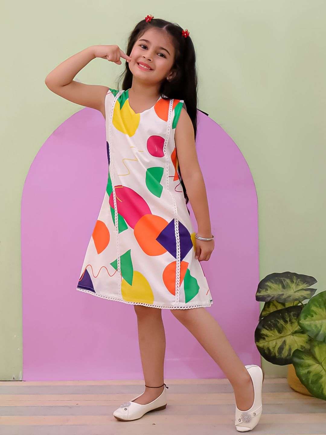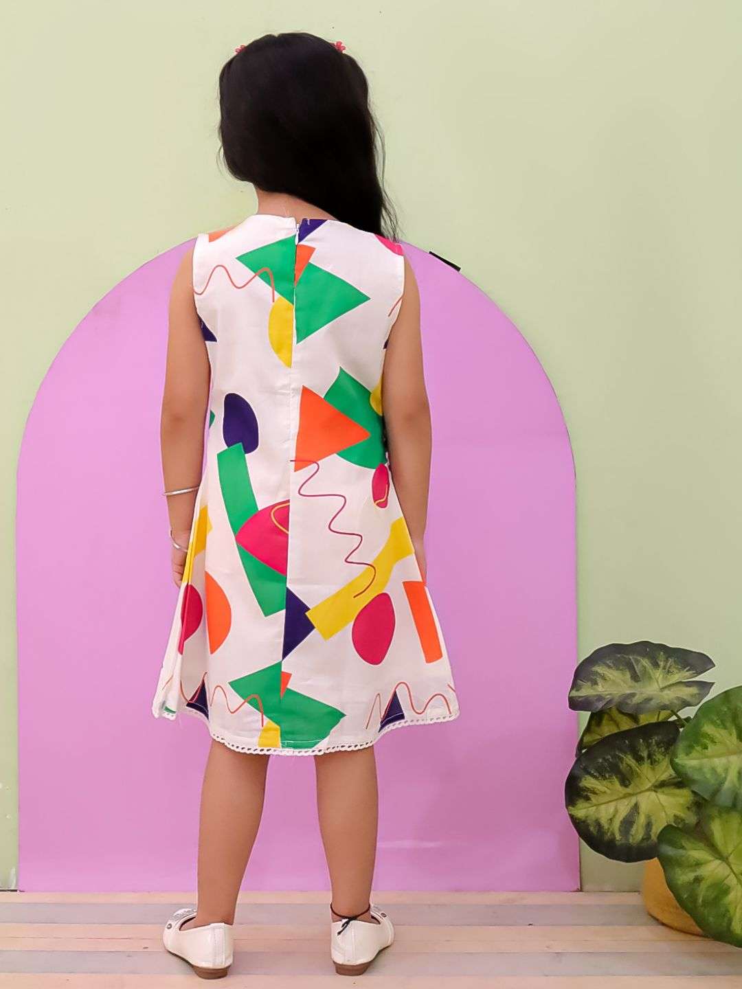 The Bold Geometric shape Pure Cotton A-Line Frock is a cheerful and stylish pick for your little fashionista. Crafted from soft, breathable 100% cotton, it’s gentle on the skin and perfect for all-day wear. The white base pops with vibrant geometric prints, making it ideal for casual outings, birthday parties, or fun playdates. Designed with a comfy V-neck, sleeveless cut, and lace detailing, it combines comfort and cuteness effortlessly.