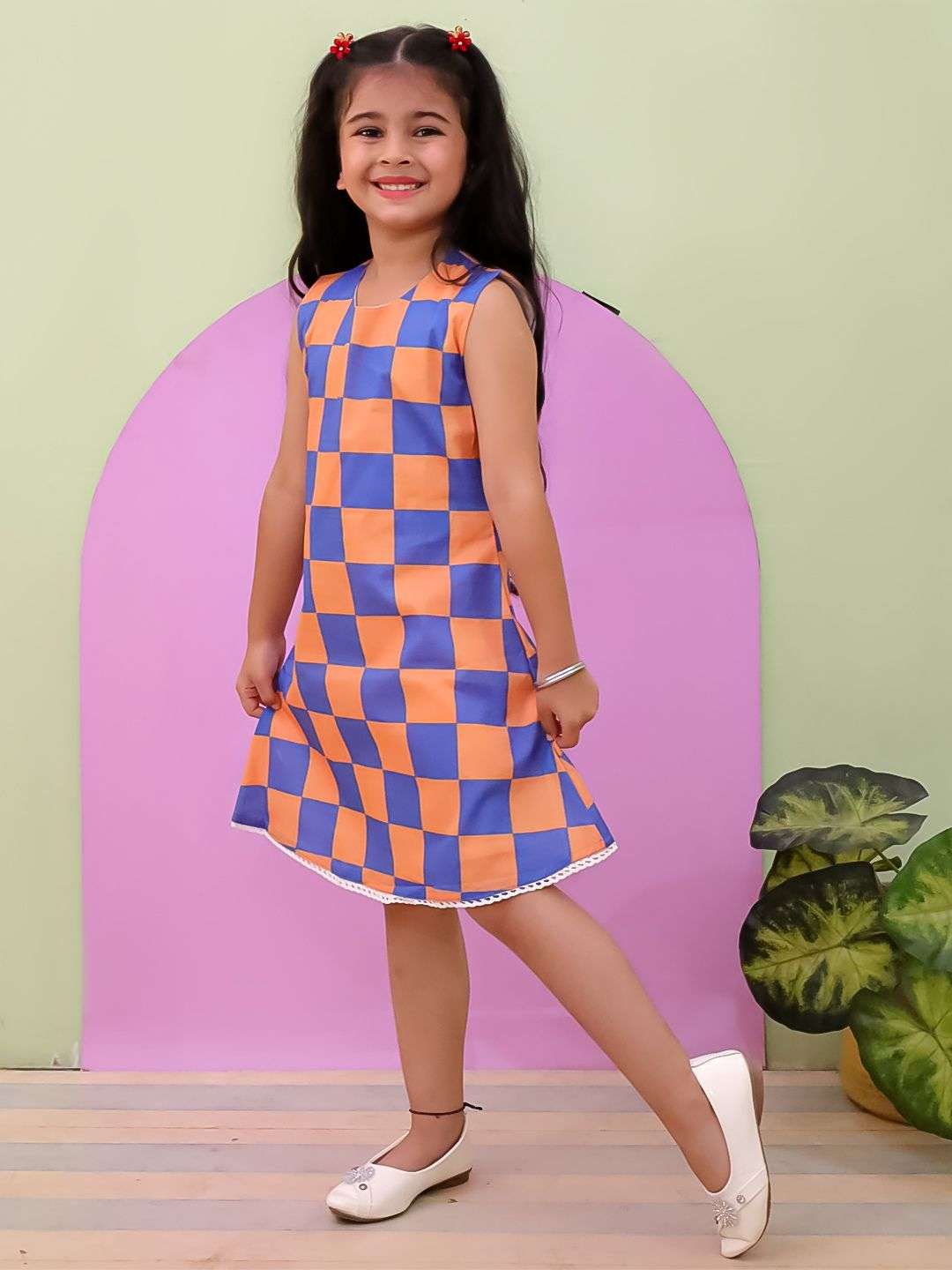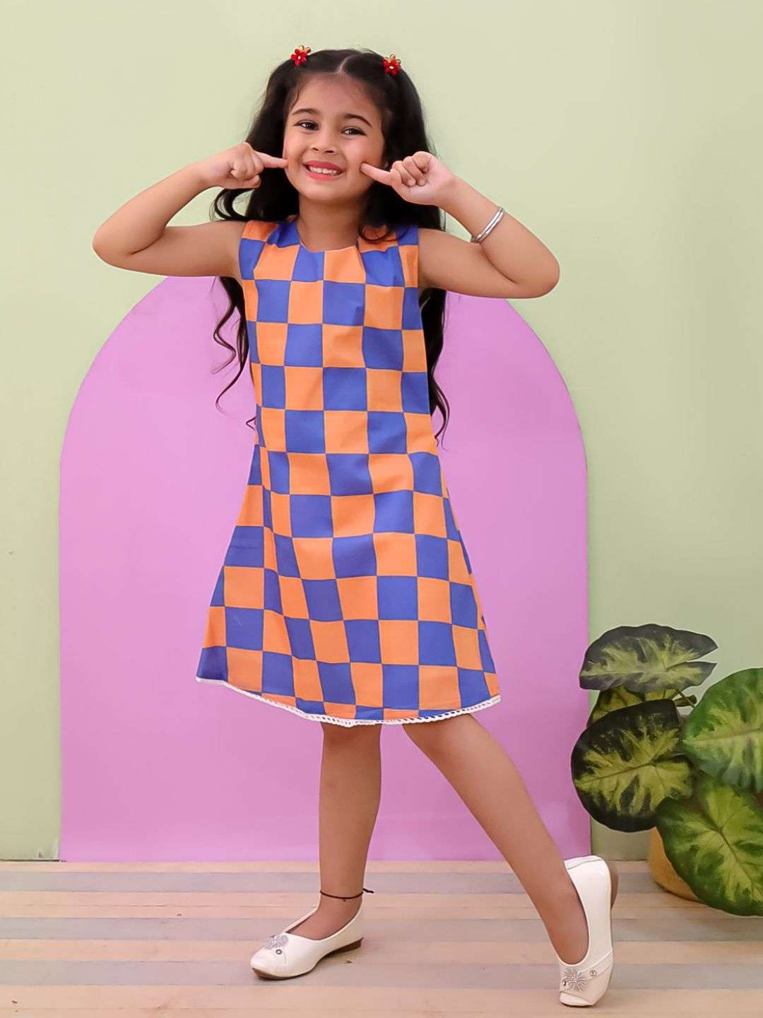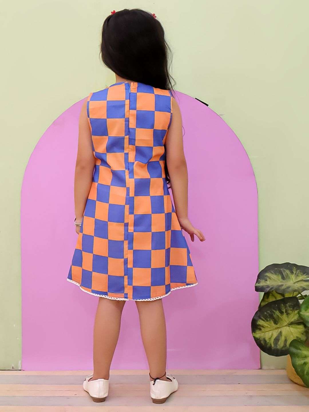 The Checker Charm Pure Cotton A-Line Frock brings a playful twist to a timeless pattern. Made from 100% pure cotton, it’s lightweight, breathable, and perfect for active kids. The vibrant orange and blue checks add a bold statement, while the sleeveless, round-neck A-line silhouette ensures freedom of movement. Whether for school functions, casual outings, or summer picnics, this frock is a fun yet versatile choice.