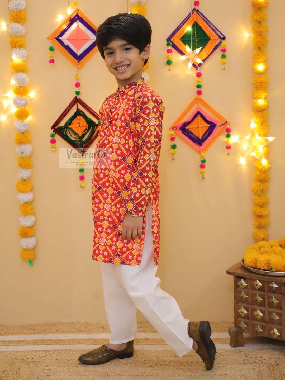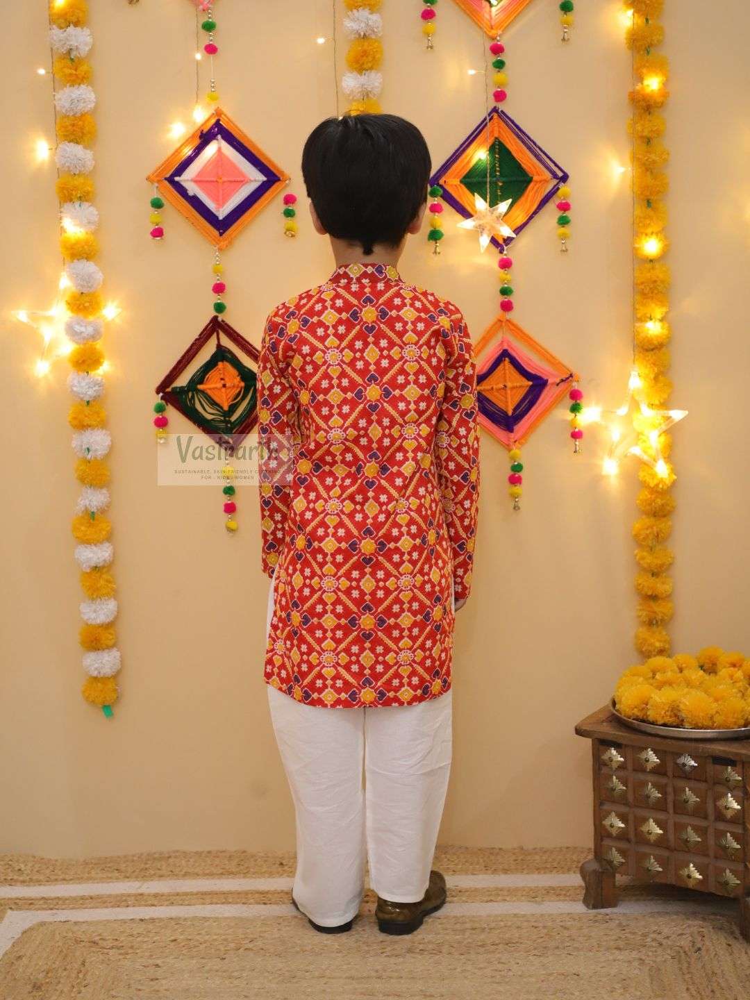 Patola Red kurta pajama- Vastrarth offers sustainable Boys Kurta Pajama Sets, designed for eco-aware families. Our collections, made from environmentally friendly fabrics, promise both luxury and durability. Perfect for weddings and cultural events, these sets provide a seamless blend of heritage style and contemporary design. Choose ethical fashion for your child’s wardrobe essentials. Colour: Red Top: Knee length kurta, Bottom: Ankle Length pant, Material & Care-Top fabric: Pure Cotton, Bottom fabric: Pure Cotton. Machine Wash with mild detergent only.